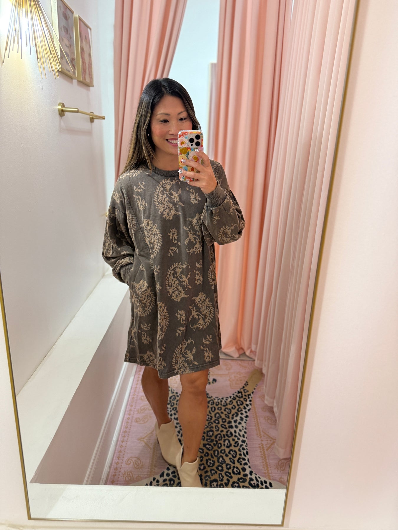 Paisley print french terry sweatshirt dress with long balloon sleeves.
