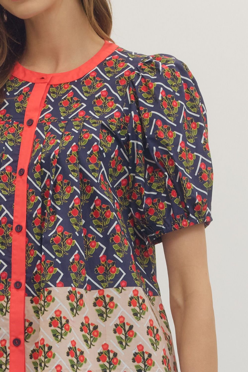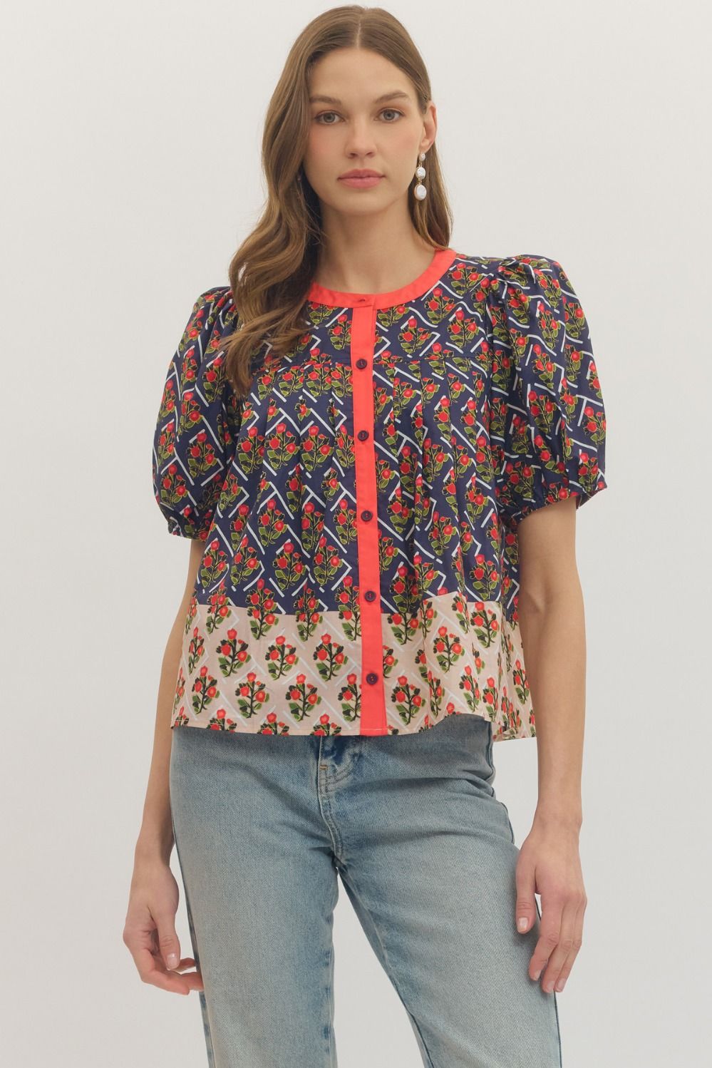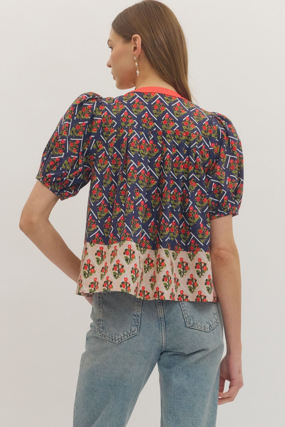Adorable two toned top, with puff sleeves, and mini red rose bouquets patterned around the top.