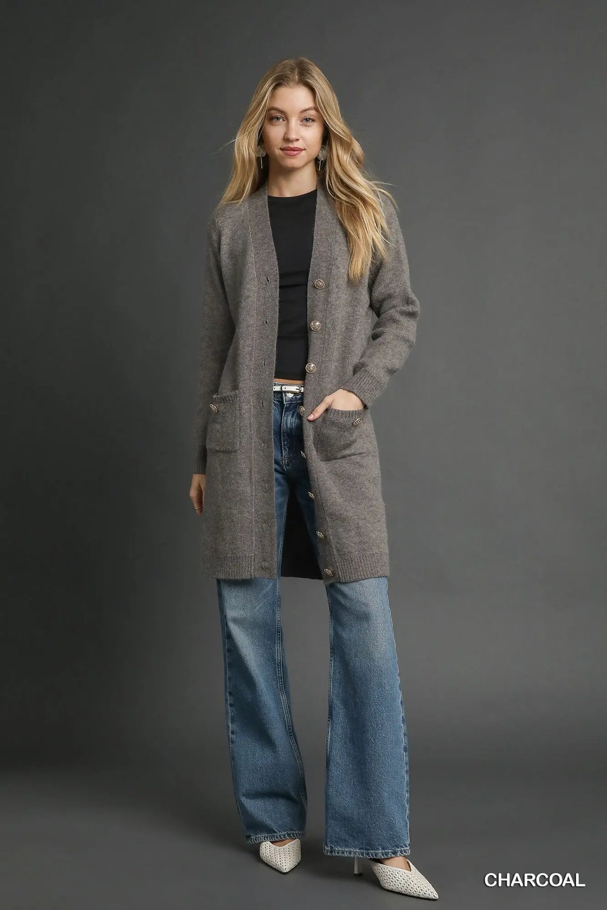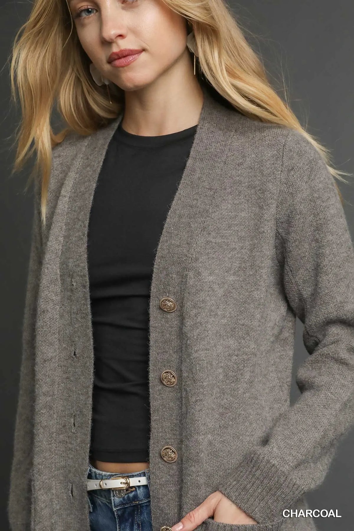 Button down cardigan dress sweater with a v-neck and wide ribbed trim.