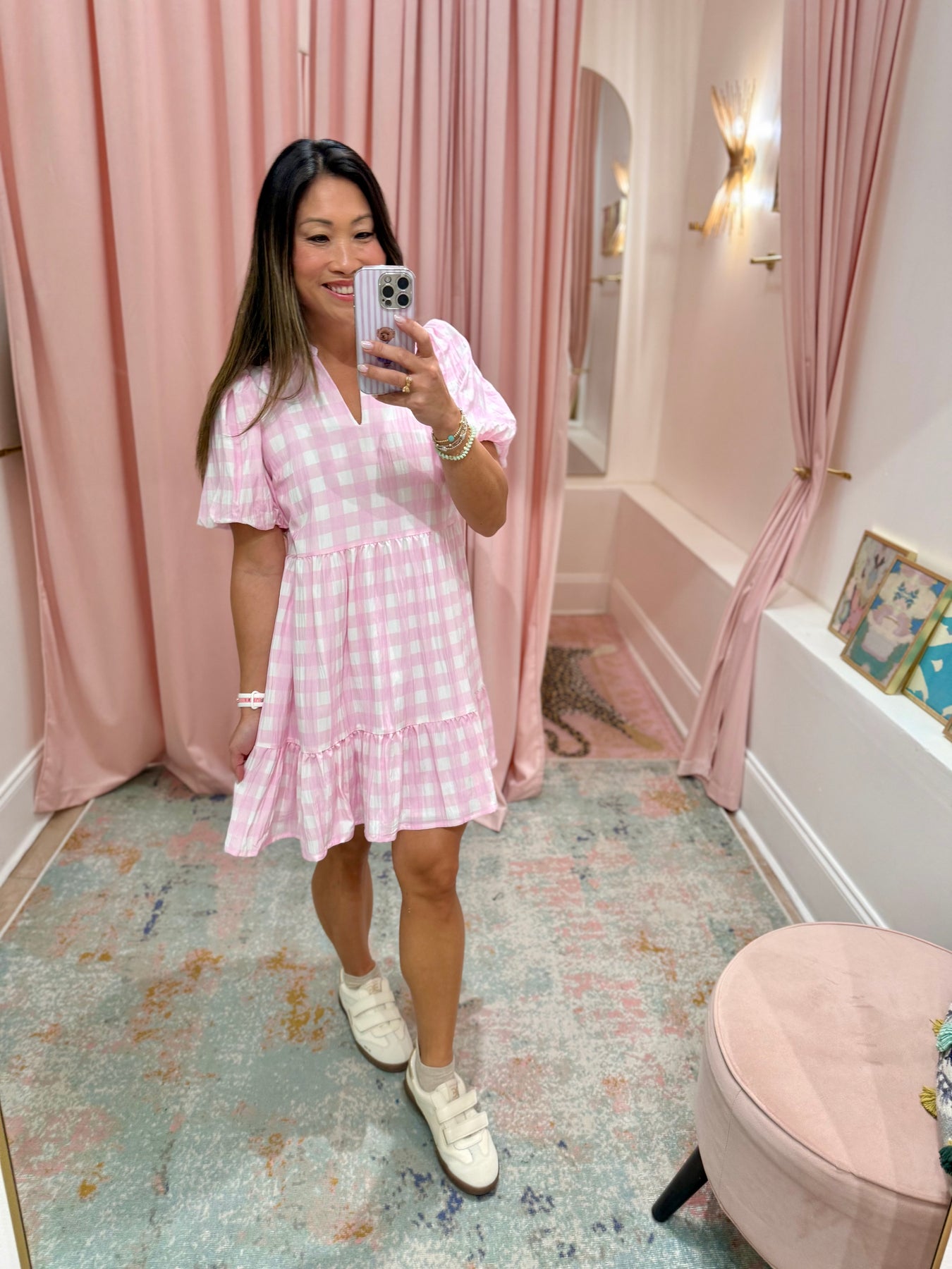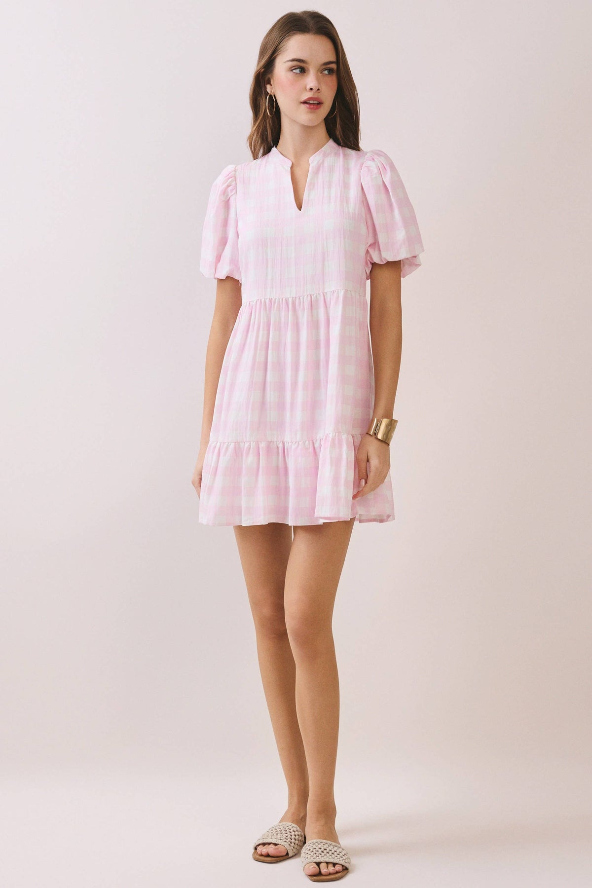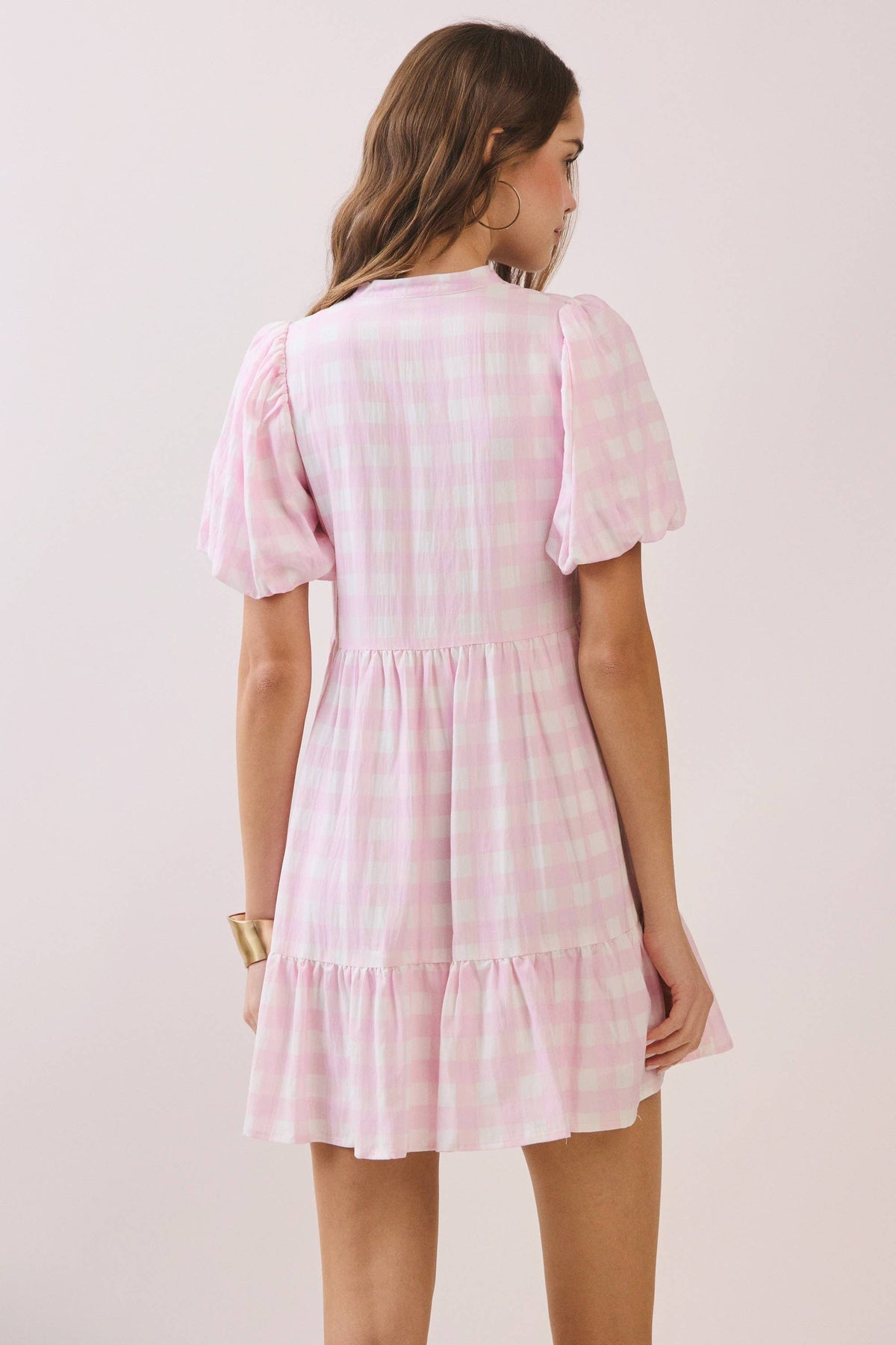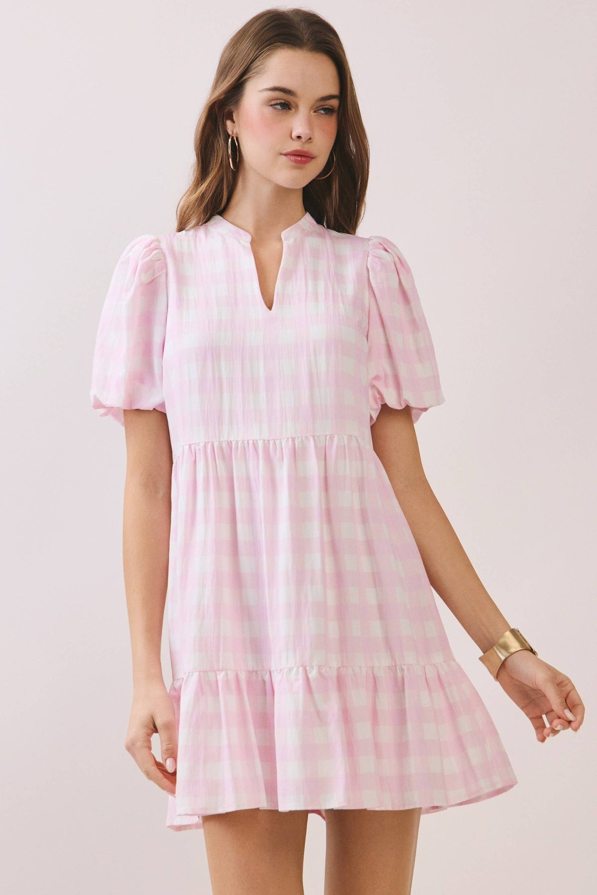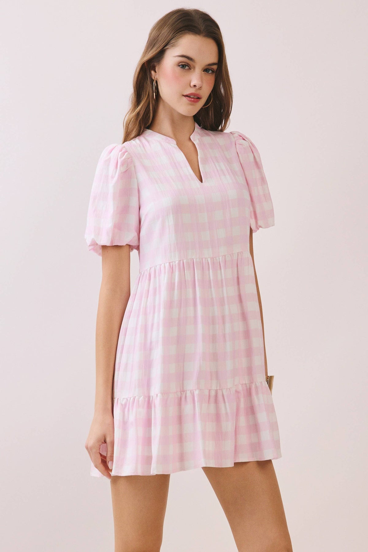 A gingham-print mini dress featuring a soft V-notch neckline and short puff sleeves. Designed with a relaxed silhouette and a tiered ruffle hem.
