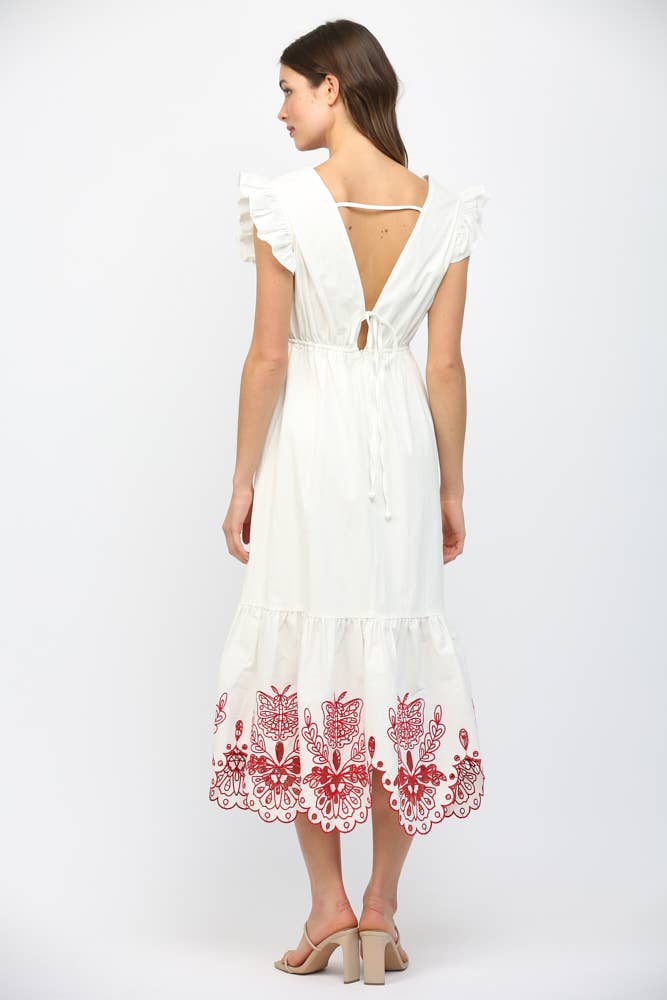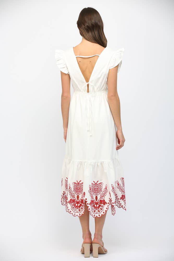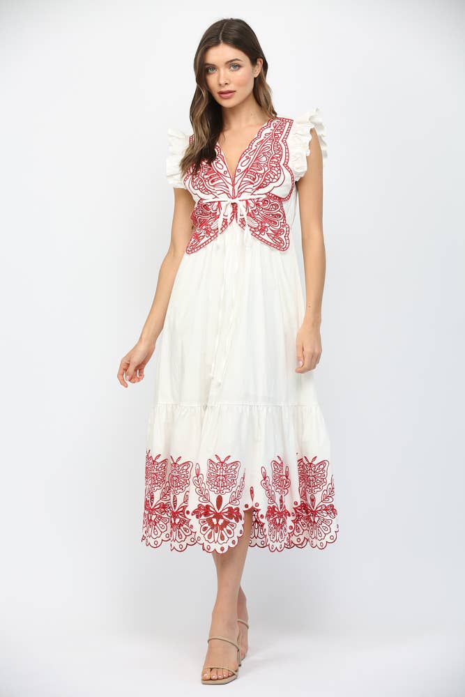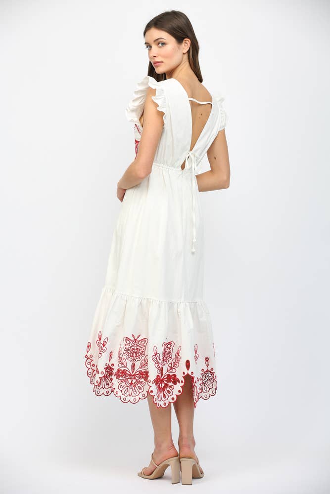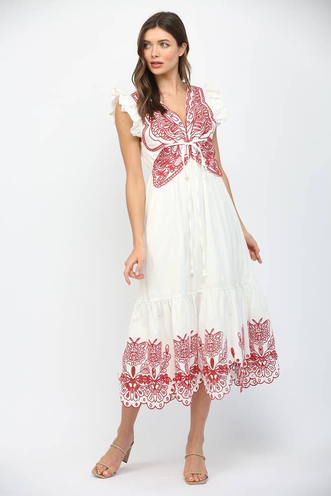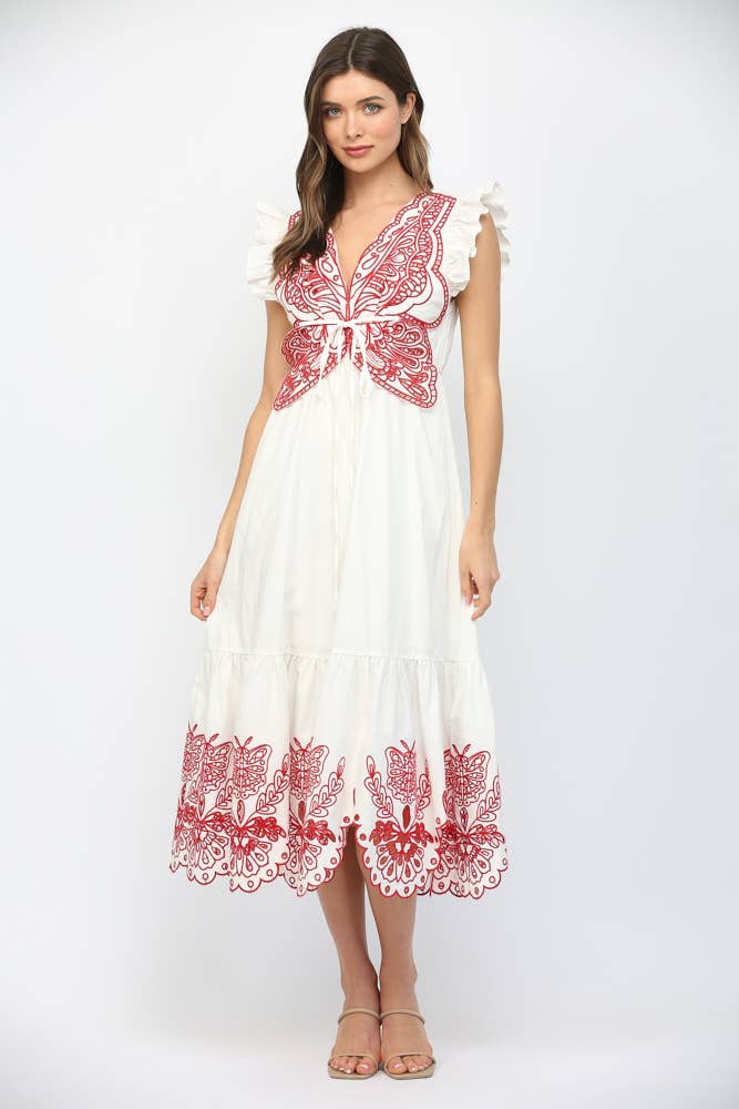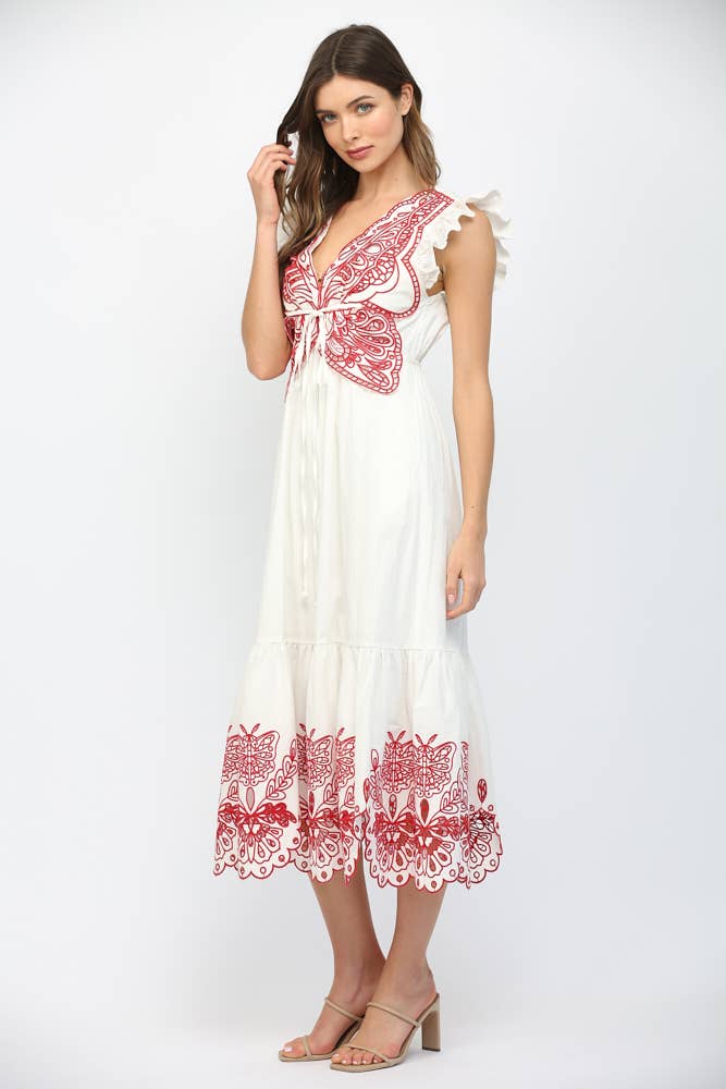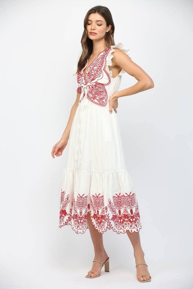 This maxi dress has a beautiful embroidered butterfly on the chest, along with floral and butterfly embroidery details at the bottom!